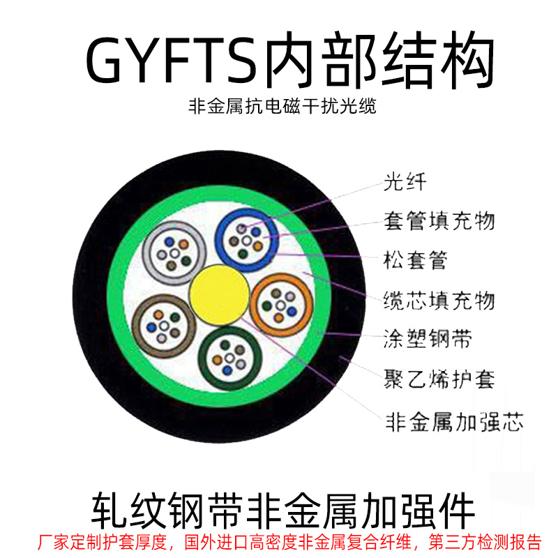 GYFTS光纜,層絞式結構,室外用、油膏填充、鋼帶縱包PE護套。采用層絞式結構,光纖套入由高模量聚酯材料制成的松套管中(光纖采用烽火及長飛的A 級光纖,保證傳輸性能優良結構性能穩定)套管內填充防水化合物。松套管 (和填充繩)圍繞非金屬中心加強芯(FRP)絞合成緊湊的纜芯,纜芯內的縫隙充以水油膏。纜芯外擠制PE護套。
